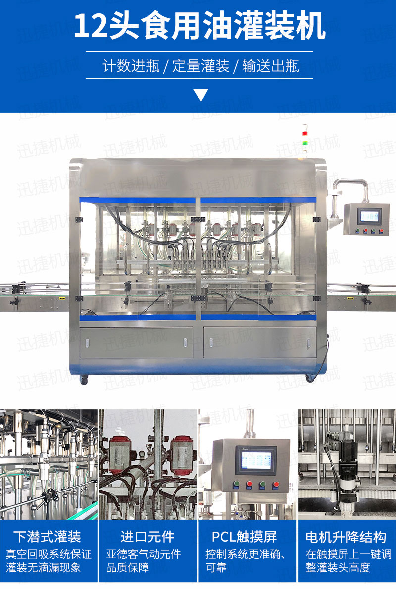 (2)摒棄了傳統夾瓶口灌裝方式,采用下潛式灌裝,在桶口以內約5-8mm處進行灌裝,下料口設計, 避免了灌裝速度快產生細小油珠噴濺污染瓶口的現象產生。配合多段式快慢速灌裝,可以保障高速灌裝時全速灌裝,又可有效解決氣壓過高快速灌裝時泡沫溢瓶現象,變頻控制更,自我保護更安全,穩定,延長設備使用壽命。