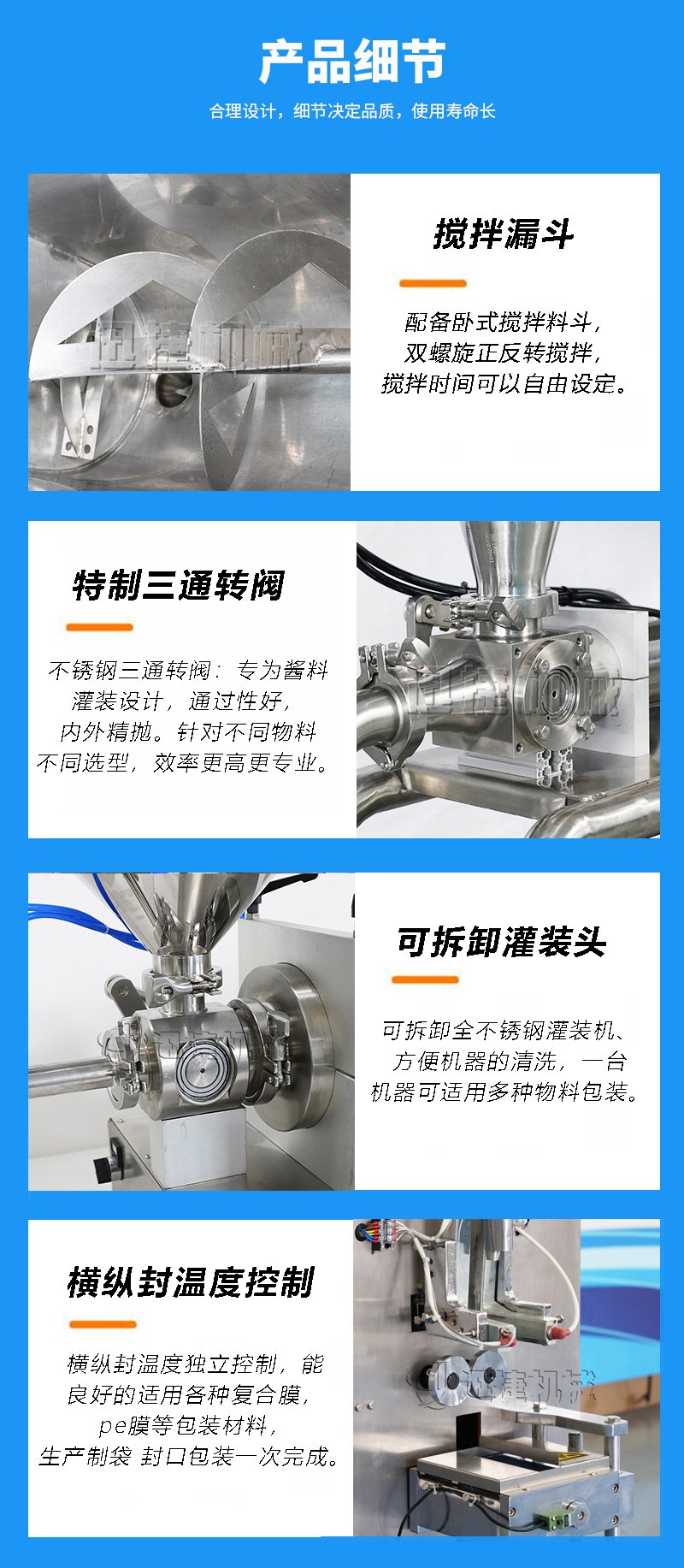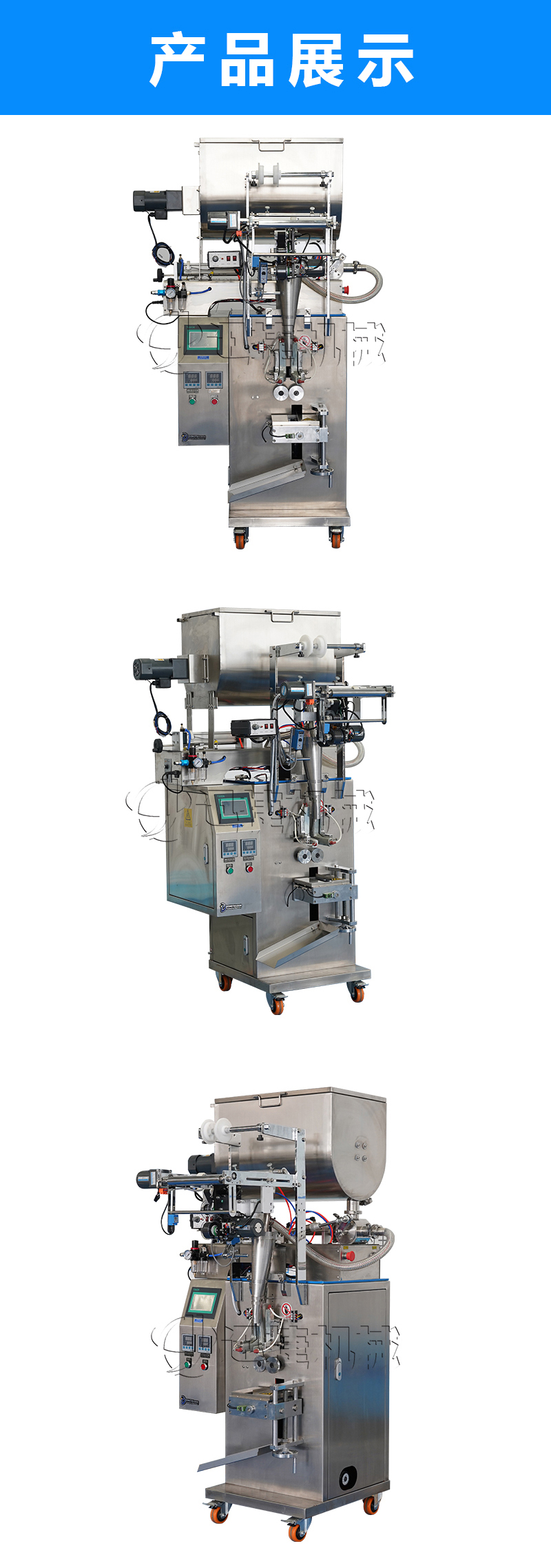 公司主要經營兩大類產品:灌裝機和包裝機。其中灌裝機主要產品有:食用油灌裝機、液體灌裝機、膏體灌裝機、自動灌裝機、全自動灌裝機、辣椒醬灌裝機等;包裝機產品有:粉劑包裝機、顆粒包裝機、液體包裝機、自動包裝機、真空包裝機等。